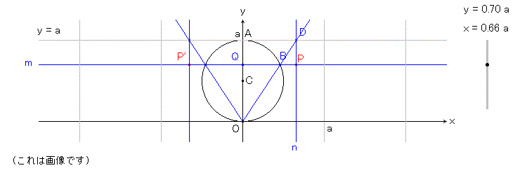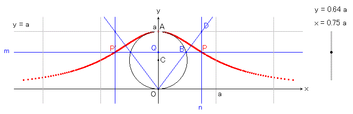<作図の順> 点 Q → 直線 m → 交点 B → 直線 OB → 交点 D → 直線 n → 交点 P 円 C は原点 O と点 A( 0,a ) を直径の両端とする円, y 軸上の点 Q( 0,y ) を通り x 軸と平行な直線を m, m と円 C との交点 を B ( √( ay-y2 ),y ) ,直線 OB と直線 y = a との交点 を D ( a √( ay-y2 )/y ,a ) ,D を通り y 軸に平行な直線を n とし,2 直線 m,n の交点を P ( a √( ay-y2 )/y ,y ) とします。 また,P と y 軸に関して対称な点を P' とします。 Q が A から O まで動くとき,P と P' をあわせて「アグネシの魔女」と呼ばれる曲線 x2 y = a2 ( a - y ) すなわち y = a3 / ( x2 + a2 ) を描きます。 <課題> D ( x,a ) から B の座標,P( x,y ) の満たす方程式を求めてみましょう。 ● をドラッグすると点 Q が移動します。 曲線(gif) 戻る |