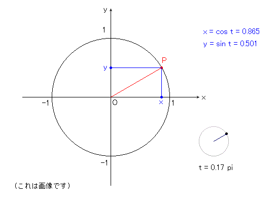 角 t ( 0≦t<2π) の動径が OP,単位円