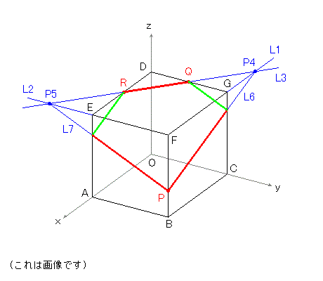 【 3 点 P,Q,R を通る平面による立方体の切り口 】
