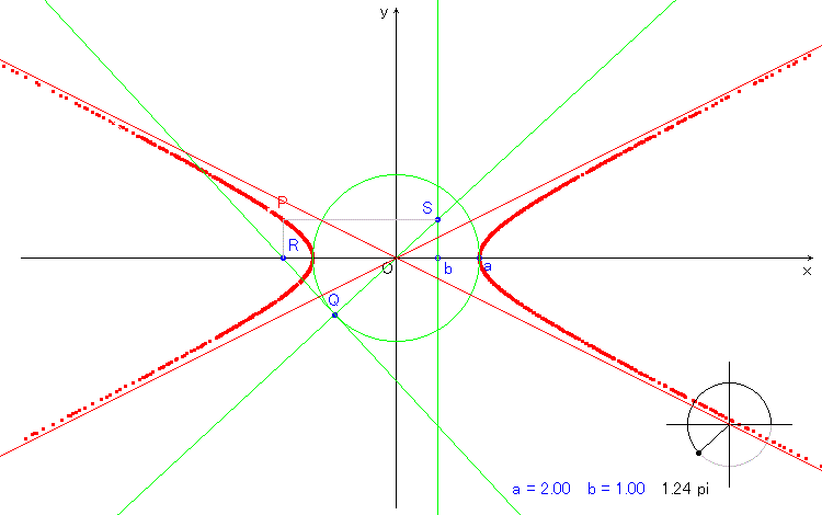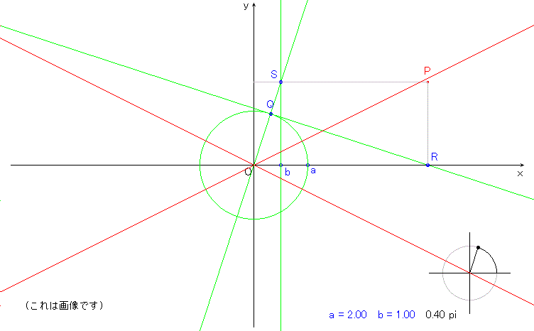 OQ は角θを表す動径で Q( a cosθ,a sinθ),R( a/cosθ,0),S( b,b tanθ) より P( a/cosθ,b tanθ) となります。