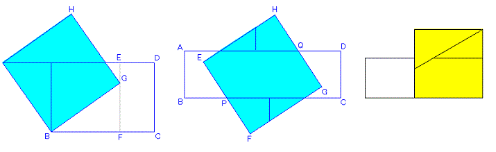 長方形 ABCD を切って並べかえて 正方形にして下さい。 AB = a,BC = b とします。 (1) a < b < 2a の場合 AE = BF = a, BG = HG = √ab ● をドラッグすると解答が示されます。 (現在のブラウザでサポートされていない プラグインを使うので画像のみが表示さ れる場合があります) figファイルのダウンロード (市販ソフト Cabri Geometry で開けます) |