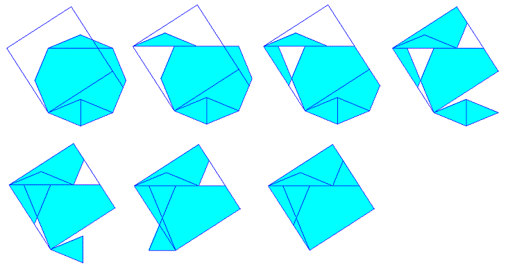 最終的に7片に切って合わせます。 もっと少ない切り方があれば教えて 下さい。 ● を順にドラッグします。 答 (現在のブラウザでサポートされていない プラグインを使うので画像のみが表示さ れる場合があります) figファイルのダウンロード (市販ソフト Cabri Geometry で開けます) 面積の計算など (pdf) |