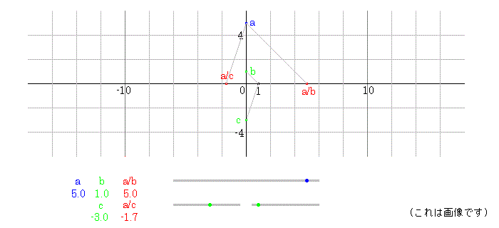 平行線を使って b → 1 ( 1/b 倍 ), a → a/b ( 1/b 倍 ) となる。