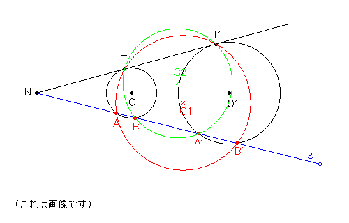 半径の異なる 2 つの円 O,O' の共通外接線の接 点を T,T',直線 TT' と OO' の交点を N とする。 N は相似の中心となる。 N を通る直線 g と円 O の交点を A,B,対応する円 O' 上の点を A',B' とする。4 点 T,T',A,B' および T,T',A',B はそれぞれ同一円周上にある。 g の ○ をドラッグして直線を移動できます。 (方べきの定理の逆により証明できる) 方べきの定理により NA・NB=NT2,NA'・NB'=NT'2 また,円 O,O' の相似比を 1:k とすると NA・NB'=NA'・NB=kNA・NB=kNT2=NT・NT' |