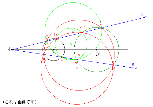 N を通る 2 直線 g,h と円 O の交点を A,B および C,D,対応する円 O'上の点を A',B',C',D' とする。 次の 4 点の組はそれぞれ同一円周上にある。 (A,B',C,D'),(A,B',C',D), (A',B,C,D'),(A',B,C',D) 証明は上の事実を用いればよい。 NA・NB'=NT・NT'=NC・ND' など 戻る |