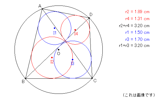 丸山良寛の定理 四角形 ABCD が円 O に内接するとき △ABC,△ACD,△ABD,△DBC の内接 円の半径を r2,r4,r1,r3 とおくと r2+r4=r1+r3 が成り立つ。 証明 (pdf) 参照:上垣渉 『数学教育』 2010/11 ○ をドラッグして点 A−D を移動できます。 |