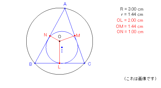 別証明のヒント △ABC の外接円の半径を R,内接円の 半径を r,辺 BC,CA,AB の中点を L, M,N とする。 このとき,R,r と OL,OM,ON の長さの 間にはどんな関係があるでしょうか。 解説 (pdf) 戻る |