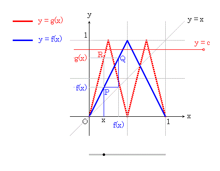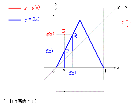 関数 f(x) = -| 2x - 1 | + 1 ( 0≦x≦1 ) を用いて, 関数 g(x) = -| 2 f(x) - 1 | + 1 ( 0≦x≦1 ) を 考える.0<c<1 のとき,g(x) = c を満たす x を 求めよ. g(x) = f( f(x) ) は f(x) と f(x) の合成関数. ( 2 つ折りして 2 倍に引き延ばすというパイ生地 作りの変換 f(x) を 2 度行う −−−→ カオス) ある x に対し,3 点 P ( x,f(x) ),Q ( f(x),g(x) ), R ( x,g(x) ) が次々に作図できます. グラフ(gif) 戻る |