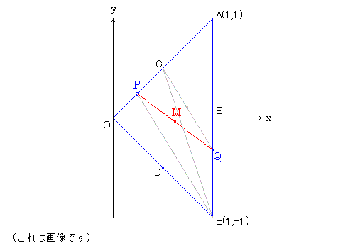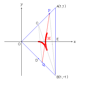 x y 平面上に原点 O と点 A ( 1,1 ),B ( 1,-1 ) を頂点とする △OAB がある.△OAB の周上の 異なる2点 P,Q は線分 PQ が △OAB の面積 を二等分するように動く.PQ の中点の軌跡を求 め図示せよ. 辺 OA,OB,AB の中点をそれぞれ C,D,E と すると (1) P が OC 上にあり,Q が EB 上にある. (2) P が CA 上にあり,Q が BD 上にある. (3) P が OD 上にあり,Q が EA 上にある. の3つの場合について考えればよいが,(3) は (1) の結果と x 軸に関して対称となる. P をドラッグして,そのことを確かめよ. 確認(gif) 戻る |