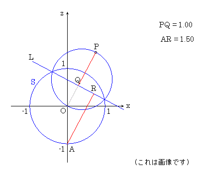 xyz 空間内の原点 O ( 0,0,0) を中心とし,点 A ( 0,0,-1) を通る球面を S とする.S の外側 にある点 P (x,y,z) に対し,OP を直径とする球 面と S との交わりとして得られる円を含む平面を L とする.点 P と点 A から平面 L へ下した垂線 の足をそれぞれ Q,R とする.このとき, PQ ≦ AR であるような点 P の動く範囲 V を求め,V の体 積は 10 より小さいことを示せ. V は z 軸に関して対称なので,P は xz 平面上 にあるとしてよい. P をドラッグして状況をみて下さい. 戻る |