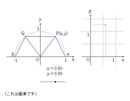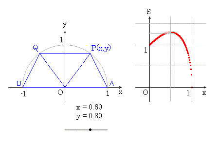 半径1の半円 x 2 + y 2 = 1, y ≧ 0 上に点 P ( x,y),Q ( -x,y),A ( 1,0),B ( -1,0) を とる.ただし x > 0 とする.台形 APQB の面 積を S とするとき,以下の問いに答えよ. (1) S を x の関数として表せ. (2) S の最大値を求めよ. ● をドラッグすると P が移動します. グラフ(gif) 類題 戻る |