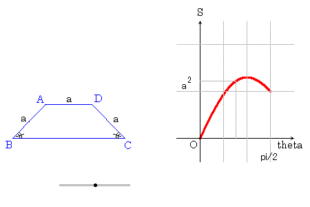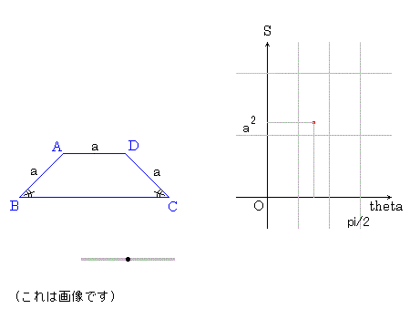 図のような台形 ABCD で, AB = CD = DA = a ( a は定数) ∠ABC = ∠BCD = θ ( 0 <θ <π/2) とするとき,次の各問に答えよ. (1) 台形 ABCD の面積 S を a とθ を用いて表せ. (2) 0 <θ <π/2 の範囲で θ を動かしたとき,S の 増減表を書け. (3) 台形 ABCD の面積 S の最大値を求めよ. ● をドラッグすると,θ (theta) が変化します. グラフ(gif)) 戻る |
