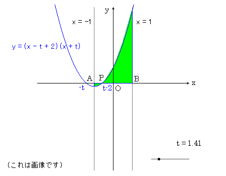 t ≧ 1 において,関数 ![]() を最小にする t の値と,そのときの最小値を 求めよ. 定積分は塗りつぶした部分の面積.t が増加 して放物線が Δy ( > 0 ) だけ下がったとき, 面積は AP・Δy 増加し,PB・Δy 減少する. すなわち増加量 (AP - PB)・Δy は t -2 = 0 の とき,負から正に変わる. ● をドラッグすると t の値が変化します. 戻る |