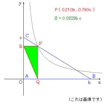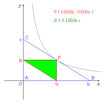 直角三角形 ABC の斜辺 BC 上を点 P が動く.P から辺 AB,AC に 下ろした垂線の足をそれぞれ Q,R とする.△PQR の面積を最大に する点 P を求めよ. AB:RP = 1:x ( 0 < x < 1 ) とすると,△ABC,△RPC,△QBP は 相似で,相似比は 1:x:1 - x であるから, 2 △PQR = { 1 - x 2 - ( 1 - x ) 2 } △ABC = …… ゆえに △PQR は x = 1 / 2 のとき,最大値 △ABC / 4 をとる. 答(gif) ○ をドラッグして確認してみましょう.図で P を通る双曲線が描いて ありますが,△PQR が最大となるとき,この双曲線と BC とはどんな 関係になりますか.また,その理由も考えてみましょう.さらに,次の 証明も考えてみて下さい. 「双曲線上の点 P における接線と 2 つの漸近線との交点を B,C とするとき P は線分 BC の中点である.」 戻る |