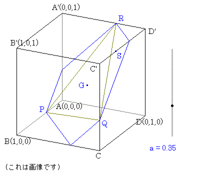 (問題文は省略) 立方体の対角線に垂直な切り口が背景となった問題です. 図のように空間座標をとると,ベクトルAB,ベクトルAD,ベク トルAA' は x,y,z 軸方向の基本単位ベクトルとなります. P ( a, 0, 0 ),Q ( 1, 1, a ),R ( 0, 1-a, 1 ) を用いると,ベクトルPQ,PR の成分は ベクトルPQ = ( 1-a, 1, a ),ベクトルPR = ( -a, 1-a, 1 ) です.これら2つのベクトルは,ベクトルDB' = ( 1, -1, 1 ) に 垂直ですから3点 P,Q,R を通る平面は対角線 DB' に垂直 になります.SQ = SR となるのは △SC'Q ≡ △RD'S のとき, ベクトル SG と DG が垂直となるのは,平面が S を通り切り 口が正六角形となるときです. ● をドラッグすると a の値が変わります. 戻る |