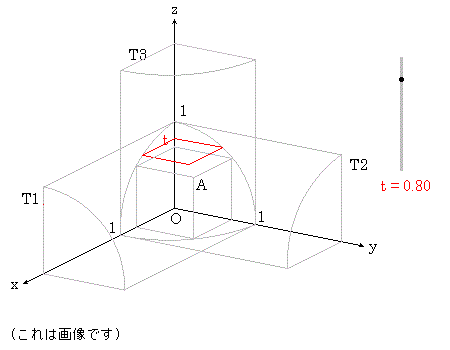 −続き− (2) T1,T2 および T3 の内部の共通部分の 体積を求めよ. 3 つの円柱は点 A ( 1/√2,1/√2,1/√2 ) で 交わります.求める共通部分は OA のまわりの x軸 → y軸 → z軸 → x軸 という回転に関して対 称になっています. ● をドラッグしてみて下さい. 求める部分は,OA を対角線とする立方体と,赤 い部分 3 個分 ( z 軸方向および x,y 軸方向 ) からできています. 戻る |