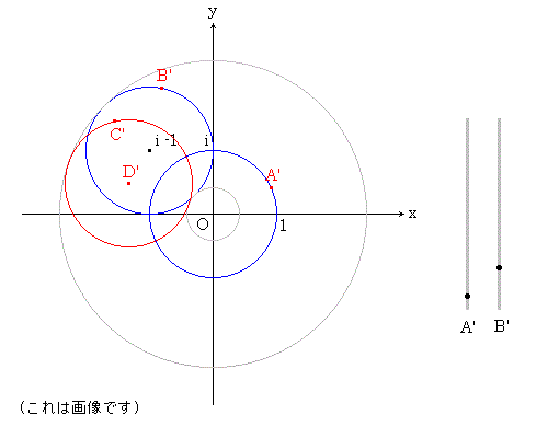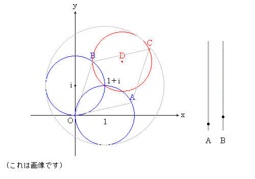 複素数 α,β は | α - 1 | = 1,| β - i | = 1 をみたす。 (1) α + β が存在する範囲を複素数平面 上に図示せよ。 A(α),B(β) とする。A は中心 1,半径 1 の 円周上にあり, B は中心 i ,半径 1 の円 周上にある。 B が一定で,A が円周上を 動くとき C( α+β ) は中心 D( 1+β ),半径 1 の円 ( 図の赤い円 ) を描く。 次に B が円 周上を動いたときの赤い円の軌跡が求め る存在領域となる。 ● をドラッグすると,A,B が動きます。 |