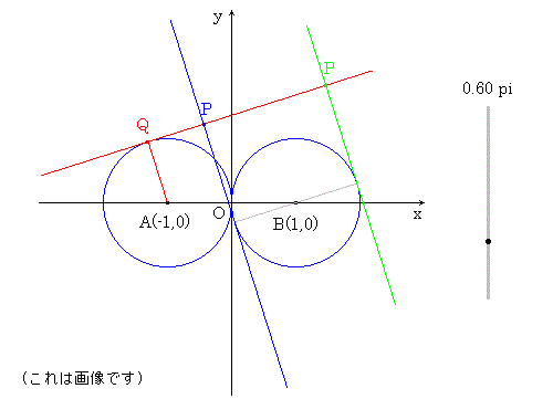 [問題] xy 平面に点 ( -1,0) を中心とする半径1 の円Aと,点 (1,0) を中心とする半径1の 円Bをとる.円Aの内部をD,円Bの内部 をEとする. (1) 点 ( -1+cosθ, sinθ) における円Aの 接線を l とする.円Bの接線mが l と 直交するとき,l とmの交点Pの座標 をθを用いて表せ. ● をドラッグするとθが変化して 点Q( -1+cosθ, sinθ ) が円Aの周上を回転します. |