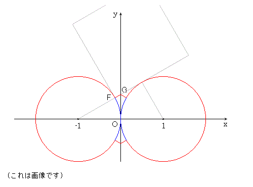 (2) 領域DにもEにも重ならないように1 辺の長さが2の正方形を xy 平面内 で動かすとき, この正方形が通りえ ない部分の面積を求めよ. この正方形が赤い線の外部を通ることは 明らか.弧 OF と線分 GF,GO で囲まれ た部分がどれだけ減少するかを考える. θ が π/6 から π/4 まで変化するとき P が描く曲線のところまで GF が下がる. [答] (1) P(cosθ-cos2θ+sin2θ-sinθ, sinθ-2sinθcosθ+cosθ) P(cosθ-cos2θ+sin2θ+sinθ, sinθ-2sinθcosθ-cosθ) (2) 3√3-2+π 戻る |