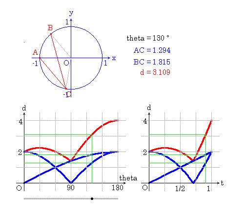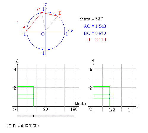 ( 問題の要旨 ) A(-1, 0), B(cosθ, sinθ), C(cos2θ, sin2θ) について,θ が 0°≦θ≦180°を動くとき d = AC + BC の最大値・最小値とそのと きの θ の値を求める. まず AC, BC, d を θ の三角関数で表す. 次に t = sin( θ/2) とおき,d を t の2次 関数に帰着して考える. ● をドラッグすると θ が変化します. グラフ(gif) 戻る |