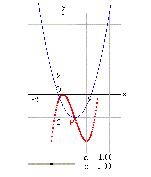 (問題の要旨) 放物線 C:y = x2 + 2ax - a3 -2a2 について (1) a が変化するときの頂点 P の軌跡を求める. 軌跡(gif) (2) -3 ≦a< 1 のとき,P の y 座標が最大・最小となるときの a の値を求める. 答 → a = 0, -3, -2 のときの C を C1, C2, C3 とする. (3) C2, C3 の方程式を求める. C1, C2, C3 の交点の x 座標を求める. (4) C1, C2, C3 の位置関係,囲まれた図形の面積を求める. 面積(gif) |