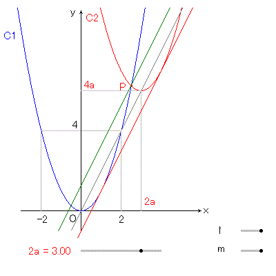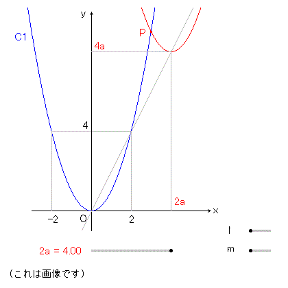 (問題の要旨) 2 つの放物線 C1: y = x2 C2: y = x2 - 4ax +4a( a+1) について次を求める。 ( a > 0 ) (1) 共通接線 l の方程式,接点の座標など (2) C1 と C2 の交点 P の座標, P を通り l に平行な直線 m の方程式, C1 と m と y 軸で囲まれた部分の面積など C2 は y = ( x-2a )2 + 4a であるから a の値が変化する とき直線 y = 2x にそって平行移動する。 このことから 共通接線 l の方程式はすぐわかります。 また,2 つの接点と交点 P の座標の間の関係について も考えて下さい。 共通接線(gif) ● をドラッグすると C2 が平行移動します。 戻る |