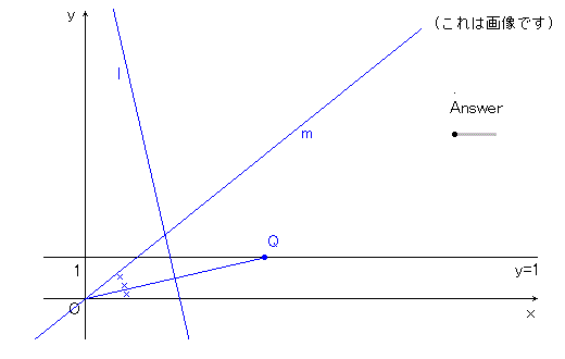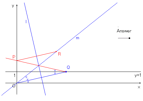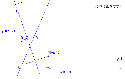 ( 問題 pdf ) OQ の垂直二等分線が l (傾きα ) だ から Q( -α ,1) (図では-a) となる。 (1) は,Q → l,l と P → R → m と 定まることを示している。 直線 QP と m は l に関して対称と なることに注意。 点 Q と P が移動できます。 答(gif) |